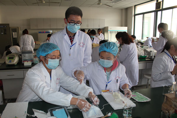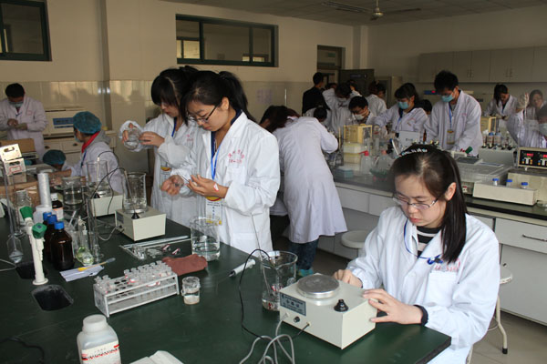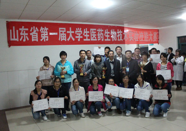 本届大学生医药生物技术实验技能大赛共有48支队伍、140名学生参加,经过严格评审最终有22支队伍进入决赛。决赛分为预实验、正式实验(实验操作、分析数据、撰写实验报告书)、答辩三个环节。经过激烈角逐,我校吴宝芳、高阳、陈茜茜同学的实验项目——“薄荷醇对氯诺昔康醇质体凝胶剂体外经皮渗透的影响”获得特等奖;郑立霞、刘莎莎、郎现波同学的实验项目——“胍丁胺对脑缺血再灌注损伤的作用”和朱倍倍、朱情情同学的实验项目——“大豆加工制品中转基因成分的PCR鉴定”获得一等奖;王文广、牟振鑫、王建玉同学的实验项目——“鹰不泊的抗氧化活性研究”和刘丽娟、孙艳萍、王丽同学的实验项目——“荧光光谱法研究槲皮素与牛血清白蛋白的作用实验获得二等奖。张树平副院长获得优秀组织奖;杨美子、李珂珂、秦加阳、李洪娟、张怀斌5位老师获得优秀指导教师奖。