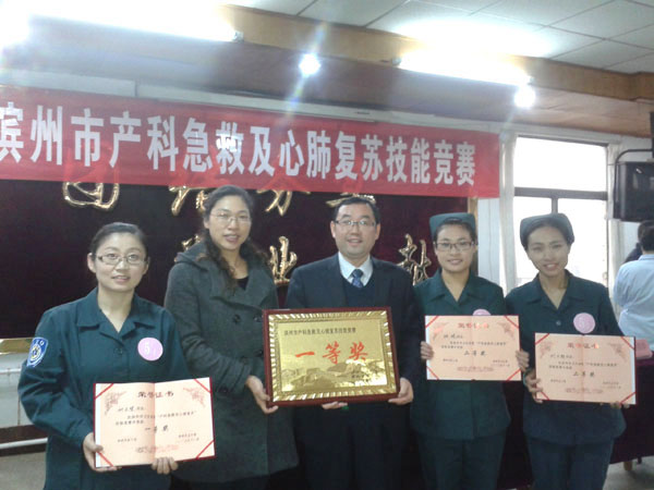 11 月23日 ,由滨州市总工会、滨州市卫生局主办的第一届“滨州市产科急救及心肺复苏技能竞赛”在滨州市妇幼保健院举行。滨州附属医院选派的刘志慧、刘文静、张晓3名选手在此次比赛中表现突出,荣获团体一等奖,获个人单项一等奖1项、二等奖2项,参加比赛的3名选手囊括本次大赛前三名。