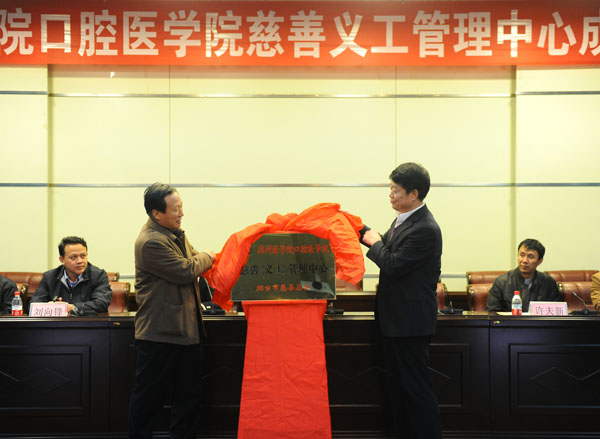 会上,李克祥与鲍寿庆共同为慈善义工管理中心揭牌。许夫新宣读了《关于滨州医学院口腔医学院慈善义工管理中心成立的批复》。