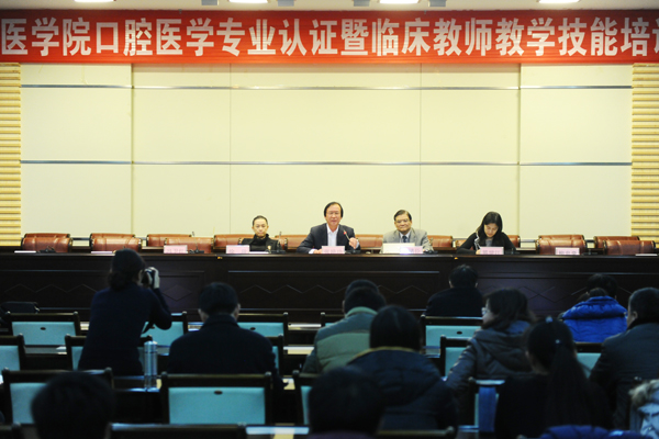 12月28日下午,学校在图书馆六楼报告厅举办2013年口腔医学专业认证暨临床教师教学技能培训班。副院长张培功出席培训班并作主旨报告。首都医科大学副校长王松灵教授,北京大学口腔医学院原副院长、我校口腔医学院名誉院长马绪臣教授,山东大学口腔医学院院长徐欣教授应邀作辅导报告。