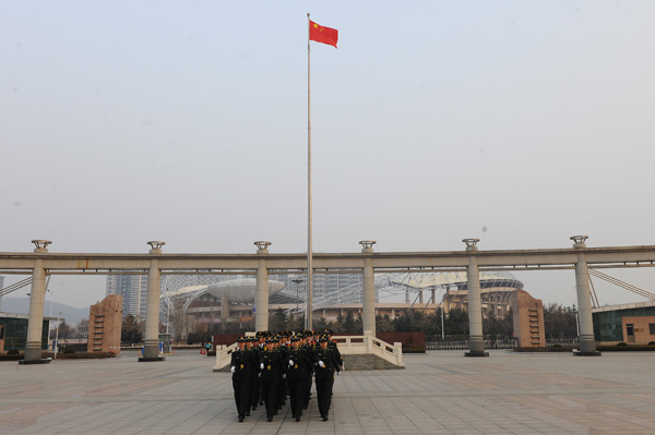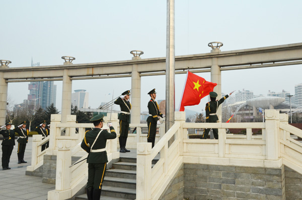 上午7:00,校国旗护卫队迈着铿锵的步伐护送国旗入场。解旗、挂旗,队员们有条不紊地做好升旗准备。伴随着庄严雄壮的国歌声,师生表情严肃,立正向国旗行注目礼,鲜艳的五星红旗冉冉升起,迎风招展,与校舍、蓝天相互辉映,构成一道亮丽的风景。