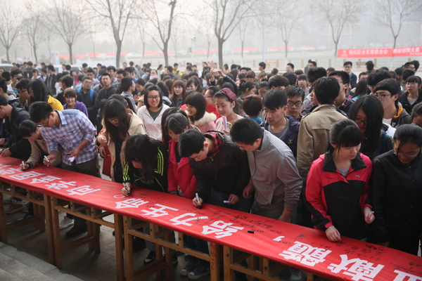 师生们在爱心条幅上签名