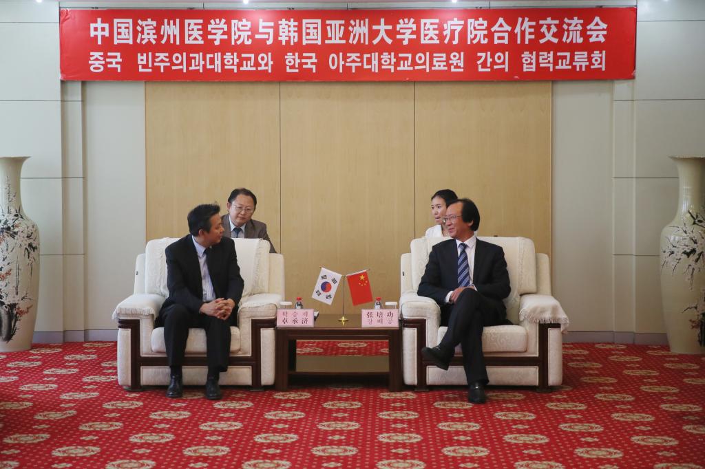 随后,双方在医药研究中心三楼进行座谈,烟台附属医院院长杨军主持座谈,并对烟台附属医学院发展规模、体制改革和学科建设等方面的情况进行了介绍。卓承济对韩国亚洲大学医疗院的情况进行了介绍,希望双方从临床医疗和护理方面建立实质性合作交流关系。