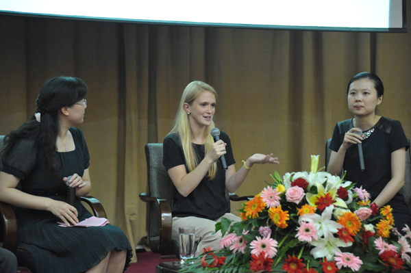 Madeleine毕业于耶鲁大学,现在凯斯西储大学医学院二年级就读。访谈会伊始,Madeleine用精心制作的PPT介绍了美丽的凯斯西储大学医学院,一张张鲜活的照片将美国医学生丰富多彩的校园学习文化生活进行了完美展现,并特别对美国医学生见习和实习阶段的学习情况做了深入的讲解。随后,Madeleine和10余位优秀学生代表进行了交流互动,针对同学们关注的美国医学教育体制、专业设置与培养、赴美留学深造、美国医疗现状等问题,用幽默、简练的语言,为大家答疑解惑。互动期间,同学们积极踊跃地举手提问,现场气氛轻松愉快,不时爆发出欢乐的笑声和阵阵的掌声。