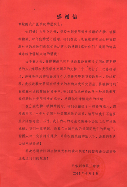 近日,学校收到一封来自雪域高原西藏日喀则第三中学的感谢信,信中提到“尊敬的滨州医学院朋友们:你们好!去年9月份,我校收到贵院师生捐赠的衣物、被褥等物品,对你们的爱心捐赠,我们在此代表我校的贫困生和我校驻村点的村民们向你们表达衷心的感谢!”感谢信字里行间透露出了暖暖的激动与敬意,感谢信也再次把我们的视线拉回了2013年暑假的那次爱心捐赠。