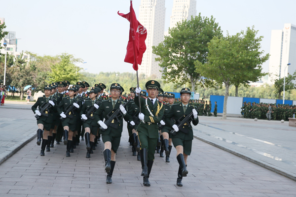上午9时,在嘹亮的国歌声中举行了升旗仪式。院长王滨在阅兵总指挥胡鹏飞少校的陪同下检阅了受训方队。 “同志们好!”“首长好!”“同志们辛苦了!”“为人民服务!”的声音响彻校园。