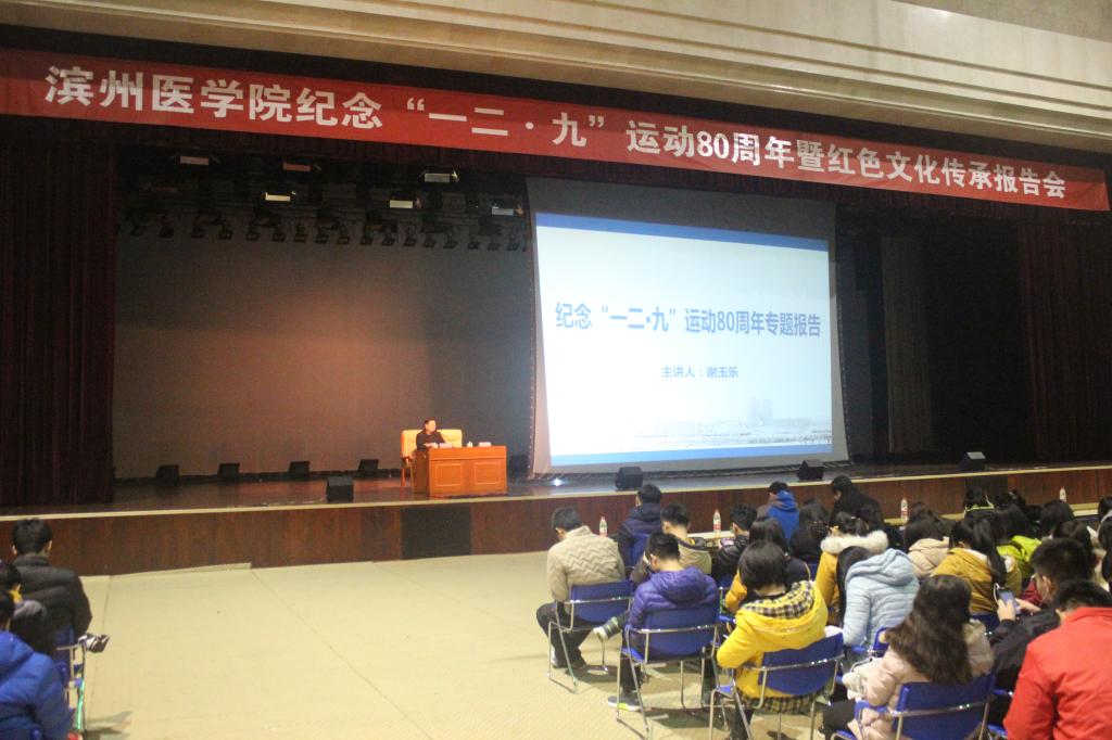 12月8日晚七点,学校在大学生活动中心举行纪念“一二·九”运动80周年暨红色文化传承报告会。烟台市关工委副主任、原中国人民解放军预备役76师师长、烟台市老战士报告团团长谢玉乐受邀为同学们作专题报告。