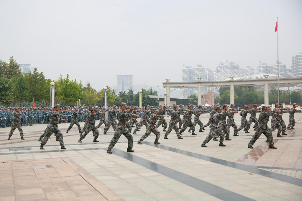 军训检阅结束后,举行了分列式汇报表演。受阅方队迈着整齐的步伐走过主席台,他们军容严整、目光坚毅、口号嘹亮、精神抖擞,充分展示出我校学子朝气蓬勃、奋发向上的精神风貌。分列式结束后,军训团教官带来威猛刚劲的捕俘拳表演,整齐的动作、挺拔的身姿,洪亮的口号、饱满的精神赢得了现场师生的阵阵掌声。