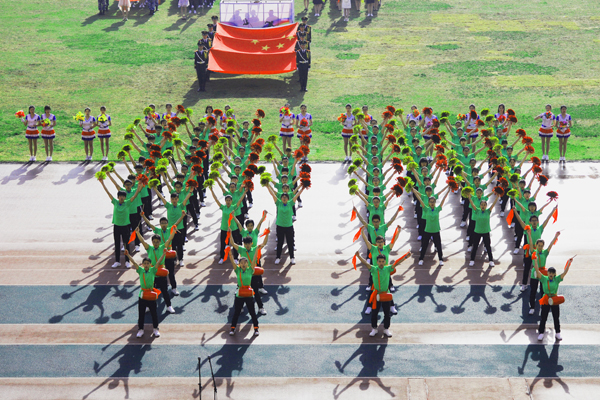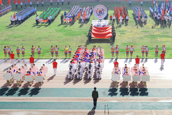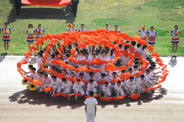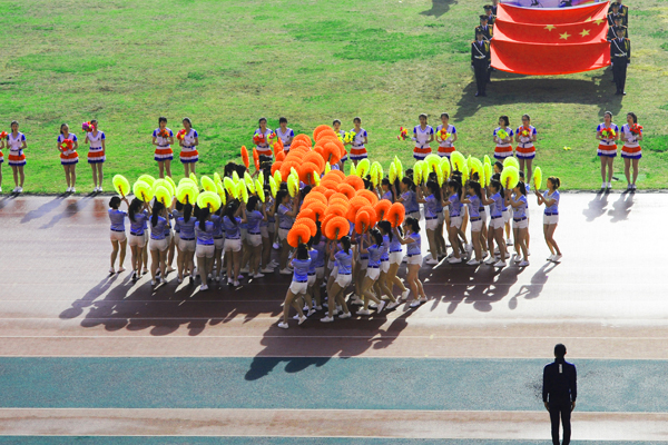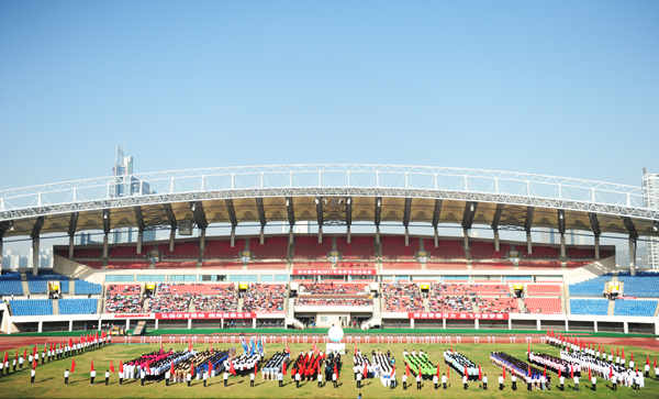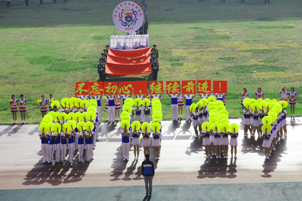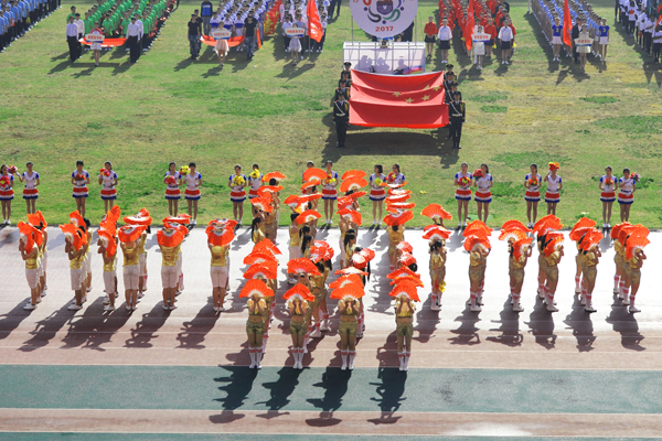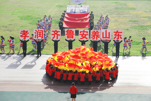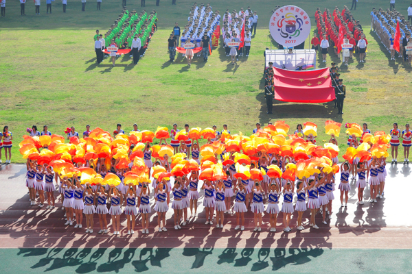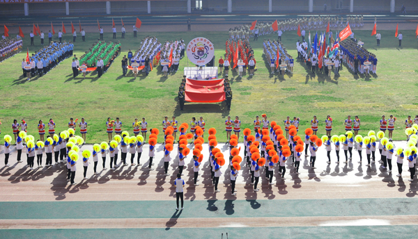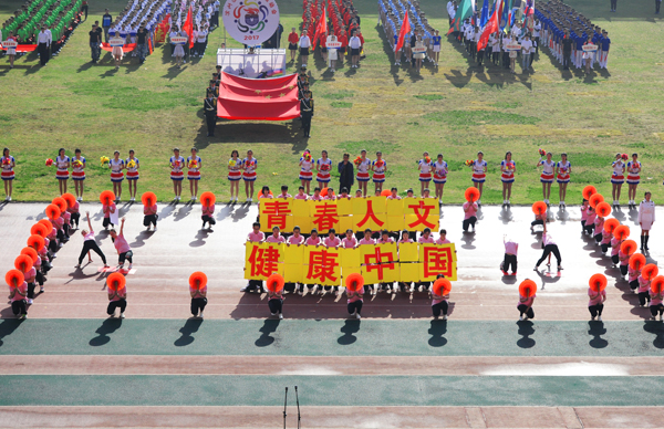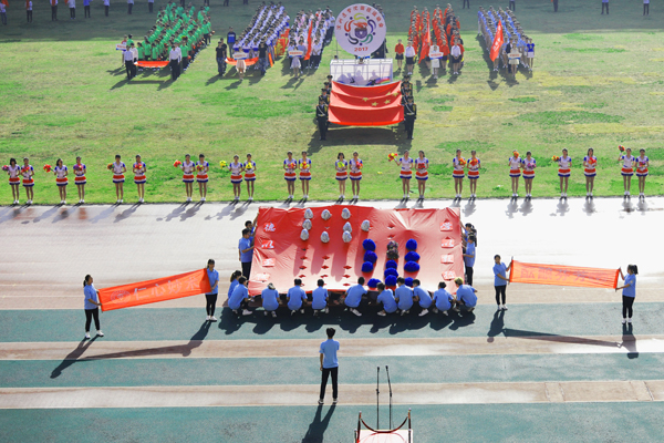 7点30分,烟台市体育公园主体育场内彩旗飘扬,人潮涌动。伴随着雄壮的乐曲,国旗方队、会徽方队、花束方队、彩旗方队、裁判员方队及14支代表队方队精神抖擞、昂首阔步进入运动场。在庄严的国歌中,全体人员起立,鲜艳的五星红旗在体育场冉冉升起。随着校党委书记车先礼宣布运动会开幕,全场礼炮齐鸣,欢呼声起,气氛热烈而隆重。