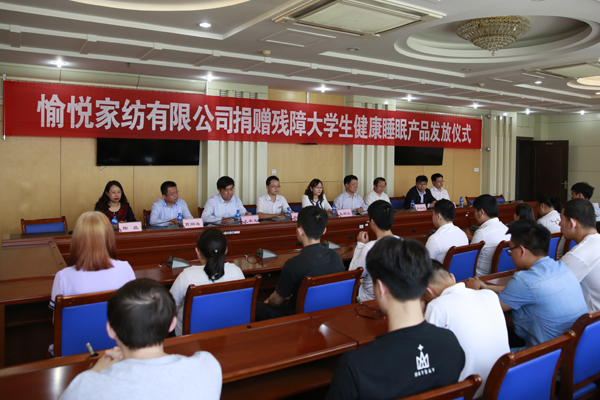 在捐赠仪式上,李克祥代表学校对愉悦家纺有限公司的爱心奉献表示衷心感谢。他指出,在第二十七次全国助残日即将到来之际,愉悦家纺有限公司对我校163名残疾人大学生捐助健康睡眠产品,充分体现了公司对同学们的关心、爱护,也寄托着对同学们奋发学习、报效祖国的美好希冀。希望同学们将爱铭记在心,珍惜大学时光、珍惜社会关爱,常怀感恩之心、修炼报恩之德、生成报恩之能,以只争朝夕的紧迫感,勤于学习、敏于求知,不断充实和提高自己,在人生的道路上开好头、起好步,以优异的成绩回馈社会、报效祖国。