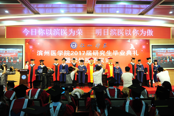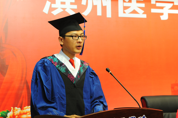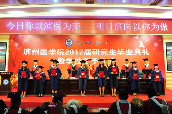 学位授予仪式上,副院长张培功宣读了《滨州医学院关于授予刘然等研究生硕士学位的通知》,副院长吕长俊宣读了《滨州医学院关于表彰2017届优秀毕业生的通报》。研究生导师代表金勇君、毕业生代表闫冬上台发言。