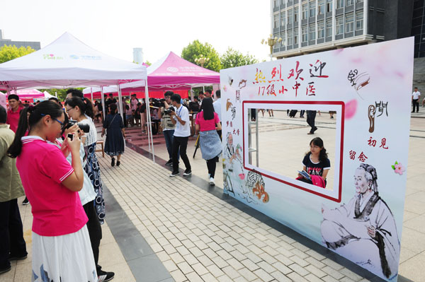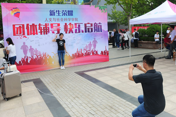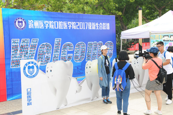 入学报到的新奇让新生有着强烈的拍照愿望,为满足新生的这一现实诉求,部分学院设置了摄影展板,为新生们提供便利。口腔医学院在新生报到现场设置了2017级新生合影墙,蓝色大气的页面和“welcome”英文单词间的照片穿插再加上活泼可爱的白体“口腔宝宝”吸引了不少同学驻足留影;人文社会与科学学院则是凸显心理特色,在合影墙上以醒目的大字标出“团体辅导 快乐起航”,并提供签字笔供新生签名留念;中西医结合学院别出心裁,在展板上设计出相框,供同学们直接凭框取影,一句“热烈欢迎17级小中医”,亲切而不失活泼,受到新生的欢迎和好评。