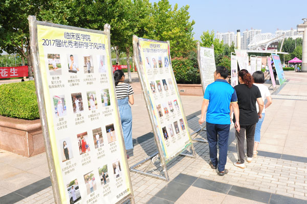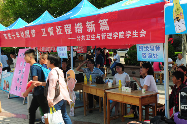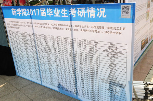 临床医学院特别制作了“2017届考研优秀学子风采展”,激励2017级新生专心学习,圆满完成学业。值得一提的是,今年我校临床医学专业和中医学专业首招5年制本科免费医学生。由于免费医学生收取的报道材料不同,临床医学院专门设置报到点,提前对服务志愿者进行专门的培训,新生报到秩序井然。药学院也以展板的形式,除了详细展现了2017届毕业生的考研情况,同时还对毕业生的就业进行了总结展出,让2017级新生直观了解到所学专业的就业、考研情况,以便于合理规划自己的学业目标。
