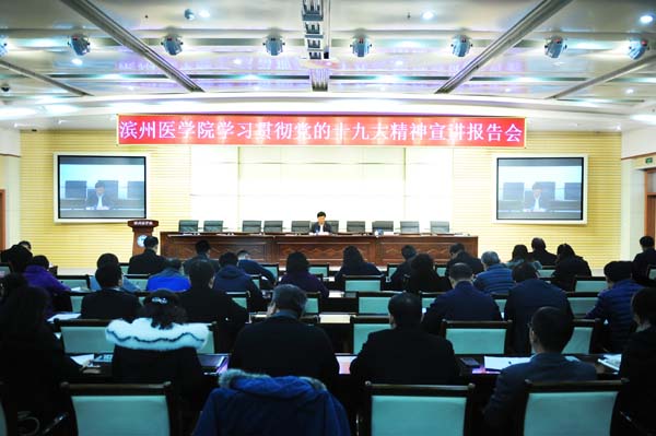 张培功在主持报告时要求,各部门、单位和院(系)要认真做好十九大精神的学习宣传和贯彻落实,紧紧围绕“立德树人”这一根本任务和建设高水平医科大学这一战略目标,主动适应经济社会发展新常态、高等教育发展新形势和医教协同新要求,把学习宣传十九大精神同谋划学校今后一个时期的改革发展结合起来,同统筹推进各项工作结合起来,同落实全面从严治党要求结合起来,从“高”处着眼,从“小”处做起,向“实”处发力,奋力谱写实现“滨医梦”的崭新篇章。