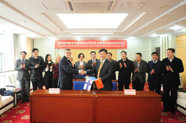 芬兰北卡累利阿地区委员会(省政府)中国合作项目总监薛美姣,卡累利阿应用科技大学国际处处长丽萨•迪莫宁(liisa Timonen),卡累利阿应用科技大学物理治疗专业教师安奈•吕哈宁(anne Ryhanen),副院长黄飞以及相关部门负责人参加会见和签字仪式。