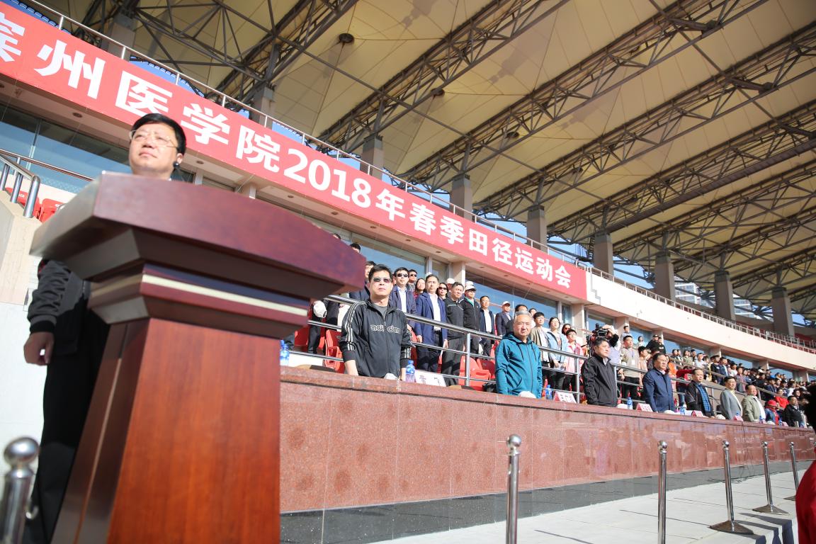 王滨在致辞中指出,长期以来,我校始终把提升学生健康素养和体质健康水平摆在重要位置,不断深化体育课程改革,不断完善体育基础设施,广泛开展群众性体育活动,学校体育工作取得了新的成绩。当前,学校正继续开展“走下网络、走出宿舍、走向操场”主题群众性课外体育锻炼活动,打造“迎新杯”足球赛、篮球赛等校园体育活动品牌,引导学生树立科学的体育观、人才观和健康观,形成“班班有体育活动、人人有体育项目”的生动局面。他强调,今年的运动会,既是落实学校体育工作的重要举措,也是学校全面落实“1345”的办学方略和目标任务,推进内涵建设的重要时期举行的一次盛会。他希望全体运动员顽强拼搏,赛出风格,赛出水平,充分展示道德风尚、团结友谊、精神风貌,切实把本届运动会办成一届纪律严明、成绩优异、文明和谐、加油鼓劲、精彩热烈的体育盛会。希望全体裁判员秉持“公开、公平、公正”的体育原则,严守规程,公正裁决,确保各项赛事顺利进行。希望全体工作人员树立安全第一的意识,忠于职守,热情服务,营造和谐的赛场氛围。希望全体观众模范遵守赛场纪律,文明观赛,积极为运动员呐喊助威,共同维护赛场秩序、展现滨医风采。