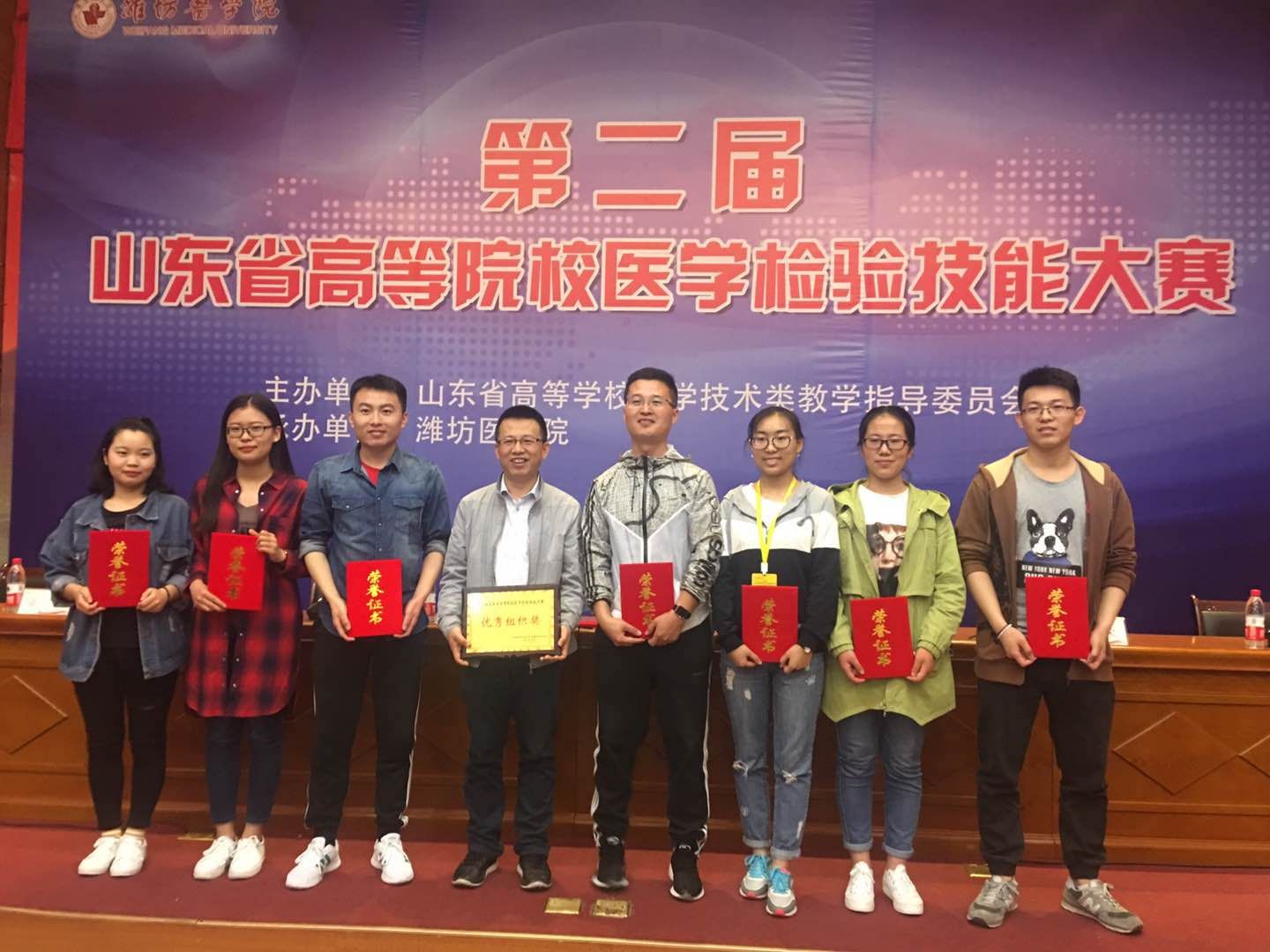 本次大赛由山东省高等学校医学技术类教育教学指导委员会主办,潍坊医学院承办,来自全省5所医学院校的参赛选手参加了比赛。我校代表队参加了琼脂糖凝胶电泳与成像分析、ELISA乙型肝炎病毒表面抗体检测、速率法测定血清转氨酶活性和形态学检验全部四个项目的角逐,并凭借出色表现获得一等奖2项,二等奖6项,三等奖1项,张玉强、王涛、赵红梅三名教师获得“优秀指导老师”称号,学校获优秀组织奖。