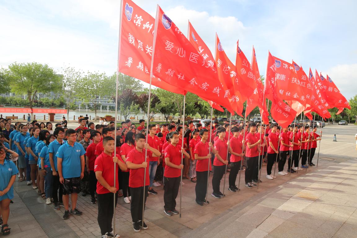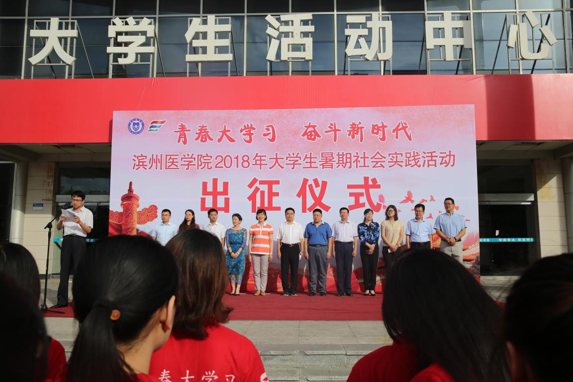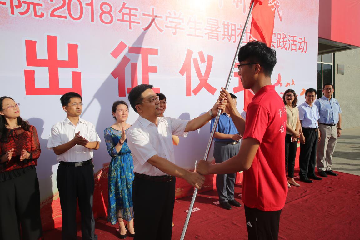 出征仪式上,孙祥军及出席仪式的部门、院(系)负责同志分别为国家级、省级、校级暑期社会实践重点团队授旗。校团委负责人介绍了2018年大学生暑期社会实践活动方案。“三下乡”国家级社会实践重点团队指导教师石磊、“健康扶贫青春行”国家级社会实践专项团队实践队员张浩然分别代表指导教师和实践学生发言。
