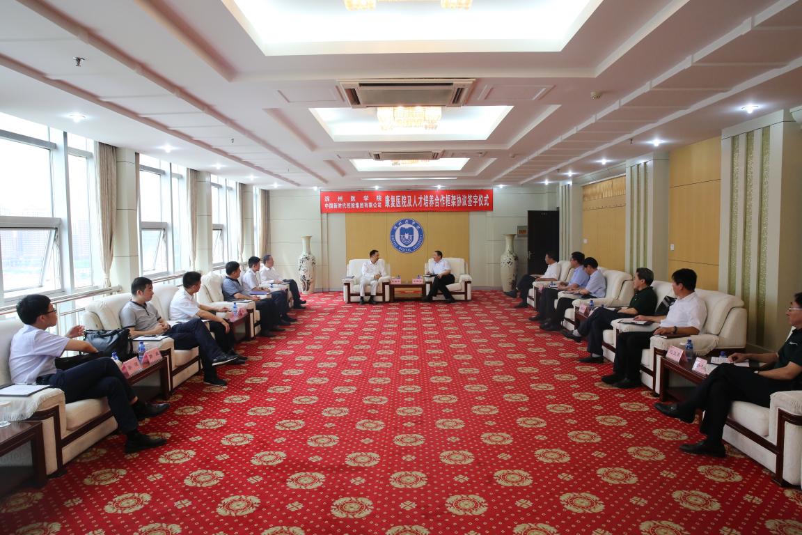 7月12日上午,学校在十楼接待室举行校企合作签字仪式,与中国新时代控股集团有限公司正式签署康复医院及人才培养合作框架协议。党委书记车先礼会见中国新时代控股集团有限公司董事长、党委书记、总经理刘国平一行7人。党委副书记李文喜以及相关部门、院(系)负责同志参加参加会议和签字仪式。