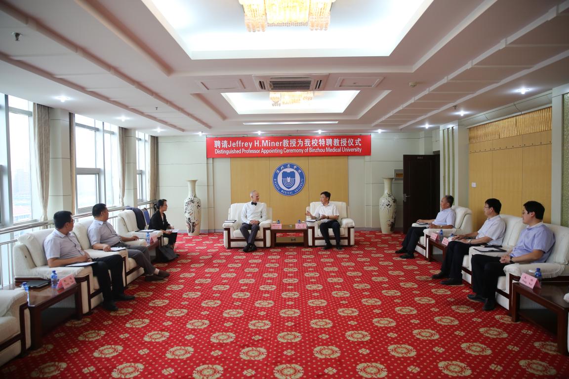 8月31日下午,学校在十楼接待室举行特聘教授聘任仪式,聘任圣路易斯华盛顿大学肾脏病研究中心主任杰弗瑞·迈纳(Jeffrey H.Miner)为我校特聘教授。院长王滨出席聘任仪式并颁发聘书。