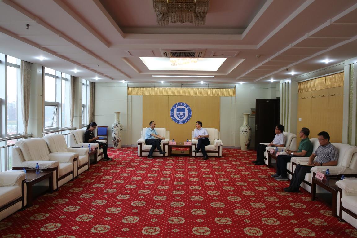 黄飞代表学校对杨合同一行的到来表示热烈欢迎。他简要介绍了学校的发展历程、办学规模、办学特色、学科专业、招生录取情况,以及学校和两所直属附属医院近年来改革建设发展情况。双方就留学生工作、对外合作办学等方面进行了深入探讨交流。