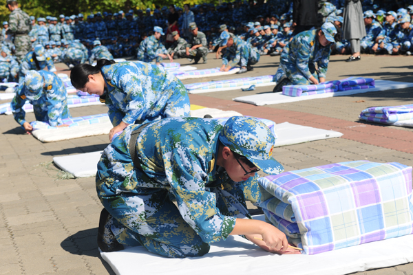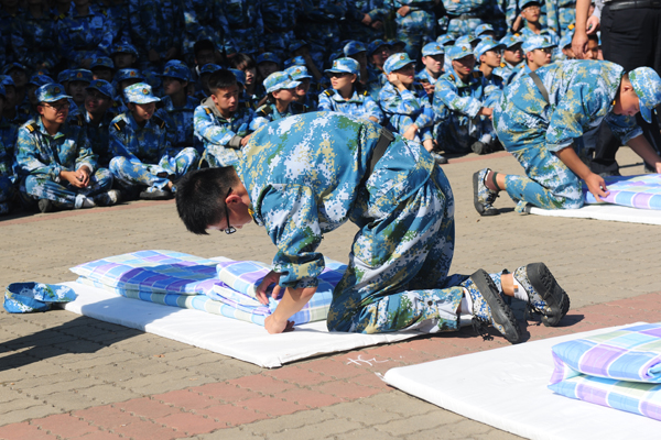 比赛共分为38个单元组,在主持人宣布了比赛规则后,发令哨声一响,各组选手展开了激烈的角逐,平铺、横拆、扯角等一系列动作有条不紊,每一个环节程序一丝不苟、分秒必争。赛场外,观众加油声此起彼伏,同学们相互交流学习,讨论心得,分享技巧,其乐融融。20分钟后,一个个整齐的“豆腐块”形成两条纵轴展现在赛场。经过裁判员公正合理的评判,最终,第2排、第6排、第7排、第9排、第10排、第20排、第24排、第30排、第31排、第34排获得优胜奖。