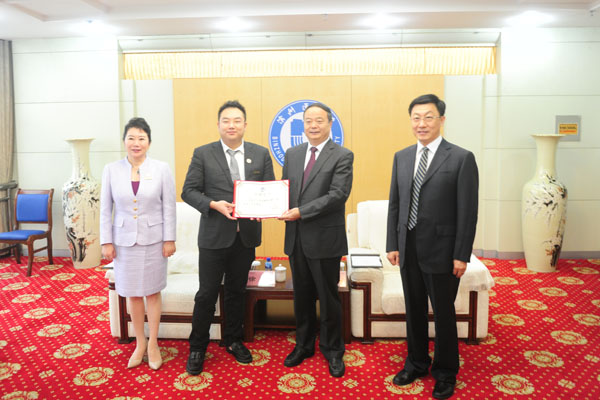 会见结束后,徐鹏代表美宝集团向学校捐赠我校77级校友、美宝集团原董事局主席徐荣祥先生的代表著作。车先礼代表学校接收捐赠专著并向美宝集团颁发了捐赠证书。