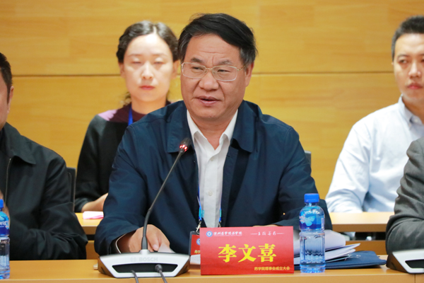 李文喜在讲话中指出,药学院率先在我校二级学院中成立理事会,这是深化教育综合改革、推进内部治理结构和治理体系建设的一项重要举措,更是药学院开展产研融合、校企合作,邀请各方力量参与办学的一次重要实践。理事会的成立,将有助于进一步加强学院与社会各界的广泛联系与合作,形成社会支持和监督学院发展的长效机制。希望学院以理事会的成立为契机,认真履行职责,全面推进各项事业再上新台阶,同时要通过理事会加强学院与企事业单位的联系合作,实现资源共享、互利共赢。