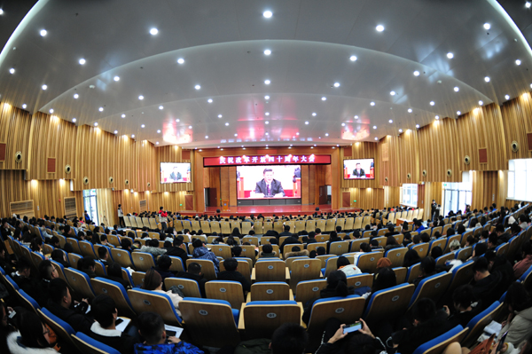 在校校领导车先礼、张宗伟、吕长俊、黄飞与党员干部、部分教职工和学生代表在荣祥楼一楼学术报告厅共同观看了大会现场直播。学校全体本科生、研究生、留学生在大学生活动中心集中观看。全体师生聚精会神,认真领会大会精神,真切地感受中国改革开放对社会经济发展所带来的巨大影响和变化,感受到国家富强,民族复兴,人民幸福,社会和谐的时代发展,为改革开放以来中国取得的成就深感自豪和骄傲。