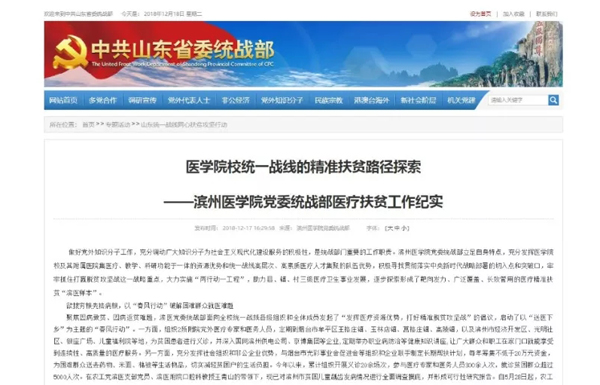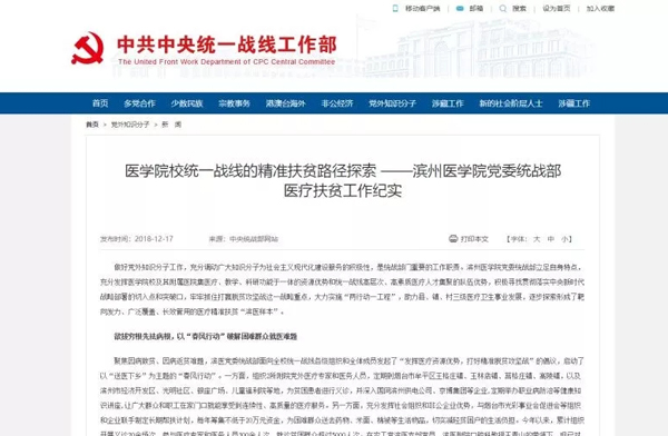 12月17日,中央统战部、省委统战部官方网站刊发《医学院校统一战线的精准扶贫路径探索—滨州医学院党委统战部医疗扶贫工作纪实》一文,对我校形成的靶向发力、广泛覆盖、长效管用的医疗精准扶贫“滨医样本”进行报道。