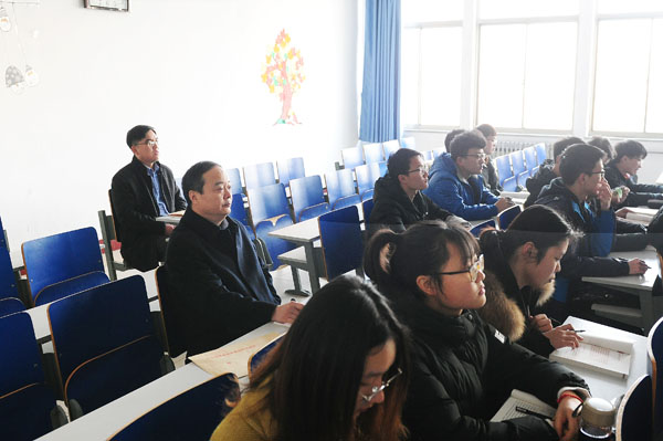 2月25日上午,校领导车先礼、王滨、李文喜、白咸勇、张宗伟、吕长俊、王广成、孙祥军、黄飞在相关部门负责同志陪同下,深入课堂听课,了解新学期教学情况。