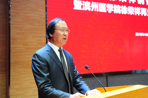 仪式上,院长王滨深情地说,徐荣祥教授铜像的落成,不仅是对徐教授的深切缅怀,也是继承徐教授遗志、推进再生医学高质量发展的宣言。他指出,当前,再生医学作为康复医学和生物医学的新领域,为疾病的机理研究和临床运用带来了革命性变化,已成为衡量一个国家生命科学与医学发展水平的重要指标。习近平总书记在两院院士大会上强调“以再生医学等为代表的生命科学领域孕育新的变革”。国务院《“十三五”国家科技创新规划》也指出,“要大力发展免疫治疗、细胞治疗、干细胞与再生医学等技术研究方向”,这为构建具有国际竞争力的康复服务体系和医药生物技术产业体系指明了方向。他强调,我校与美宝集团发挥各自的资源优势,成立再生医学研究中心,旨在抢抓康复医学和再生医学研究发展机遇,将徐荣祥教授创立的人体再生康复科学的理论与实践尽快转化为应用科学成果,同时,推动我校康复医学和再生医学学科建设,开展基础理论研究、药物合作研发和临床应用研究,联合培养康复医学和再生医学人才,为建设优势突出特色鲜明高水平医科大学作出积极贡献,也为推动美宝集团创新发展服务。他表示,徐荣祥铜像落成和徐荣祥再生医学研究中心的成立,不仅是双方合作的深化、细化和实质性进展,更是对徐荣祥教授的无限怀念、感念、纪念。他希望,学校与美宝集团一起扬帆起航,进一步深化交流、增进友谊、凝聚共识、奋勇前行,推动双方发展实现合作共赢,共同将徐荣祥再生医学研究中心打造成山东乃至全国再生医学的品牌,为再生医学事业和人类生命事业的发展做出新的更大贡献。