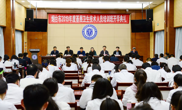 4月15日上午,2019年烟台市基层卫生技术人员培训班(第一期)开学典礼在我校烟台附院门诊六楼报告厅举行。院长王滨,烟台市卫健委党组成员、副调研员金玲出席仪式并讲话,烟台附属医院主要负责人、相关科室负责人,烟台市莱山区、牟平区、福山区卫生健康局负责人以及授课专家教授、培训班全体学员和学校公费医学生近200人参加典礼。