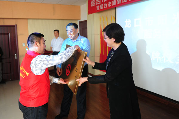 冯雷与揣文汇为“龙口市阳光助残服务中心”授旗牌