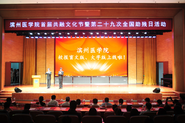 活动中,《滨州医学院报》盲文版、大字版正式发行。校报负责人向视障生以及学校档案馆赠送了盲文版、大字版校报,并详细介绍了校报盲文版、大字版的创办初心、制作过程以及未来愿景。视障学生代表石瑜皓同学饱含深情朗诵盲文校报文章《二系的男子汉》,浑厚有力的嗓音,直击心灵,将残疾人大学生自强不息、励志笃行的形象刻画的淋漓尽致。由党委宣传部出品的微电影《向阳花木》正式上线发布,带给全场满满的感动,向阳花木易逢春,断枝不挡争春势。品味其中之蕴意,皆是滨医的大爱情怀。参演微电影的学生代表也纷纷上台,表达出参演感受,他们乐观、阳光、的精神感染着所有的观众。