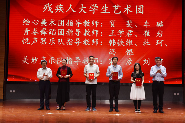 活动现场,还成立了残疾人大学生飞鸽宣讲团、残疾人大学生艺术团,并为专业指导教师颁发聘书。