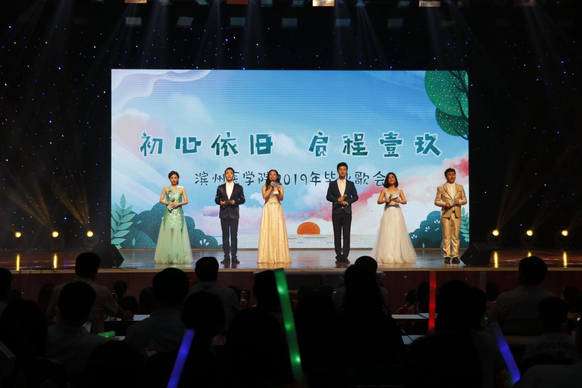 本次毕业歌会精心筹备、精彩频现,校团委微信公众号“滨医青年”对歌会进行了全程直播,2017届毕业生代表、考取北京大学研究生的王振宇同学特别录制了祝福视频,2018届毕业生代表赵卓非、张大川同学更是来到晚会现场,以自身经历现身说法,为2019届毕业生鼓劲加油。