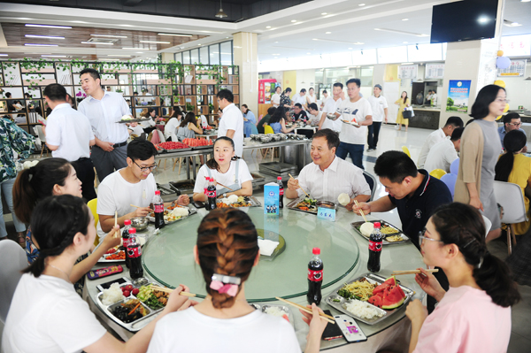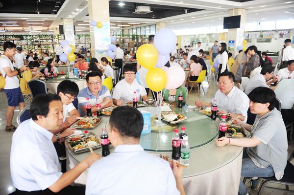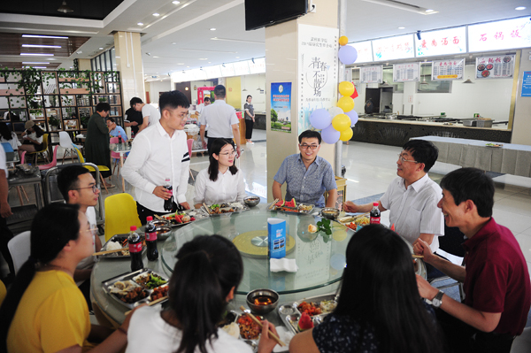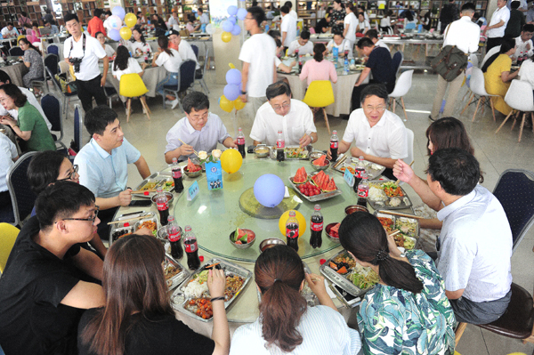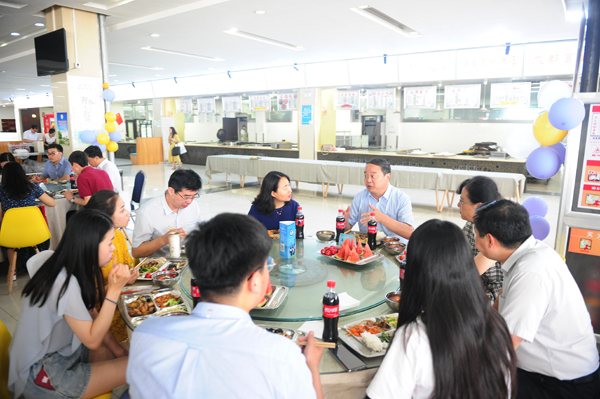 7月3日中午,在领略了毕业典礼的依依离别与深情鼓励之后,我校2019届研究生毕业生来到第二餐厅三楼,与师长共享学校为毕业生特别准备的免费午餐。校党委书记车先礼、院长王滨、党委副书记李文喜、纪委书记马东太、副院长吕长俊,校党委委员、党委组织部部长周连顺,校党委委员、党委宣传部部长张玉龙以及相关部门负责同志、研究生指导教师代表来到就餐现场,与研究生毕业生坐在一起共享“舌尖上的送别”,聊人生,谈梦想,了解同学们毕业后的发展规划,倾听同学们的深情感悟,在毕业MV《我和滨医不说分手》的悠扬的歌声中弥漫着恬淡的离愁别绪和依依的不舍深情。