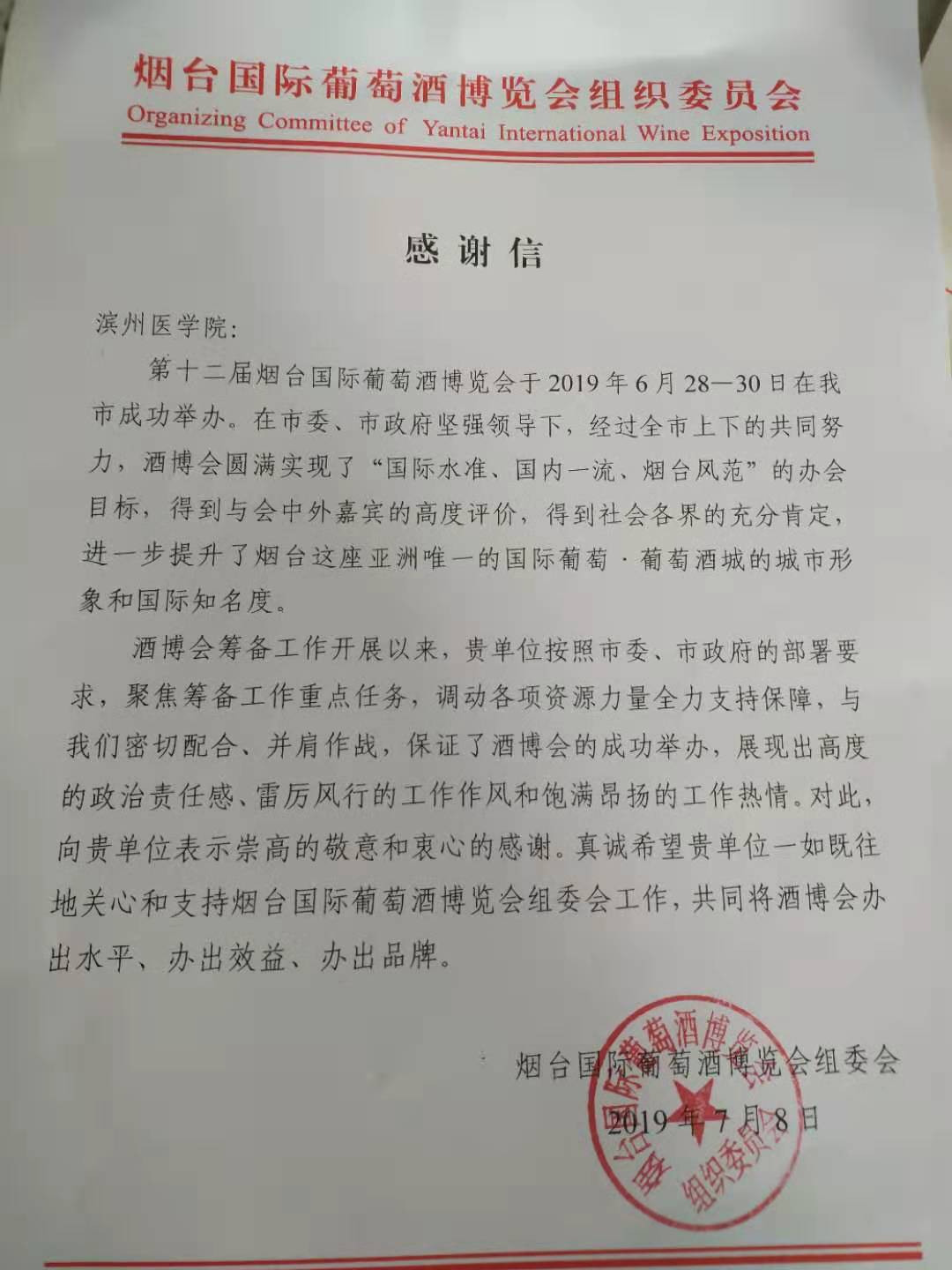 烟台国际葡萄酒博览会组委会致学校的感谢信