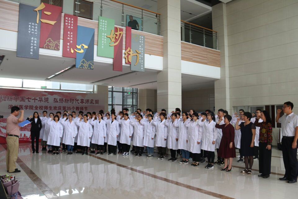 临床医学院院长金昌洙教授领誓,全体同学和老师庄重的举起右拳,齐声宣誓“健康所系,性命相托。当我步入神圣医学学府的时刻,谨庄严宣誓:我志愿献身医学,热爱祖国,忠于人民,恪守医德,尊师守纪,刻苦钻研,孜孜不倦,精益求精,全面发展。我决心竭尽全力除人类之病痛,助健康之完美,维护医术的圣洁和荣誉,救死扶伤,不辞艰辛,执着追求,为祖国医药卫生事业的发展和人类身心健康奋斗终生。”