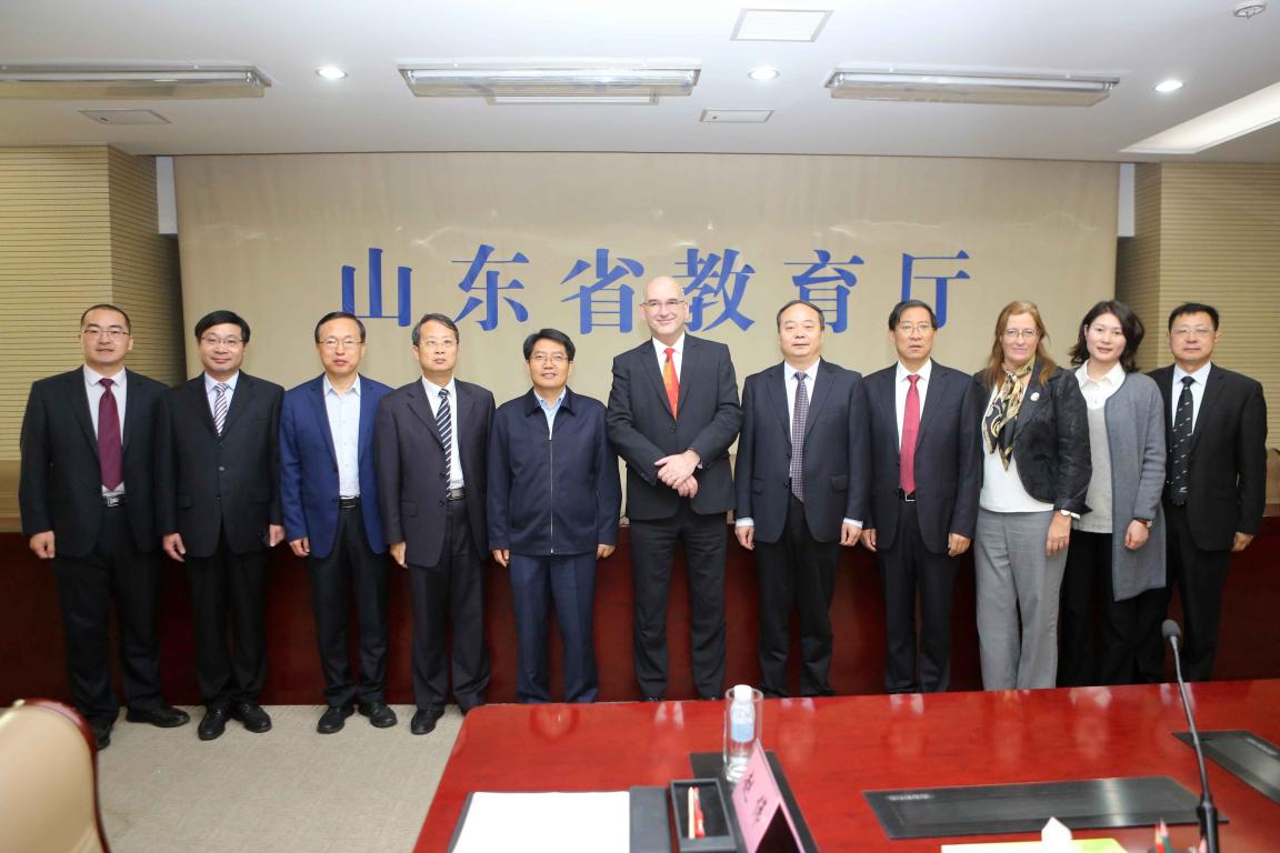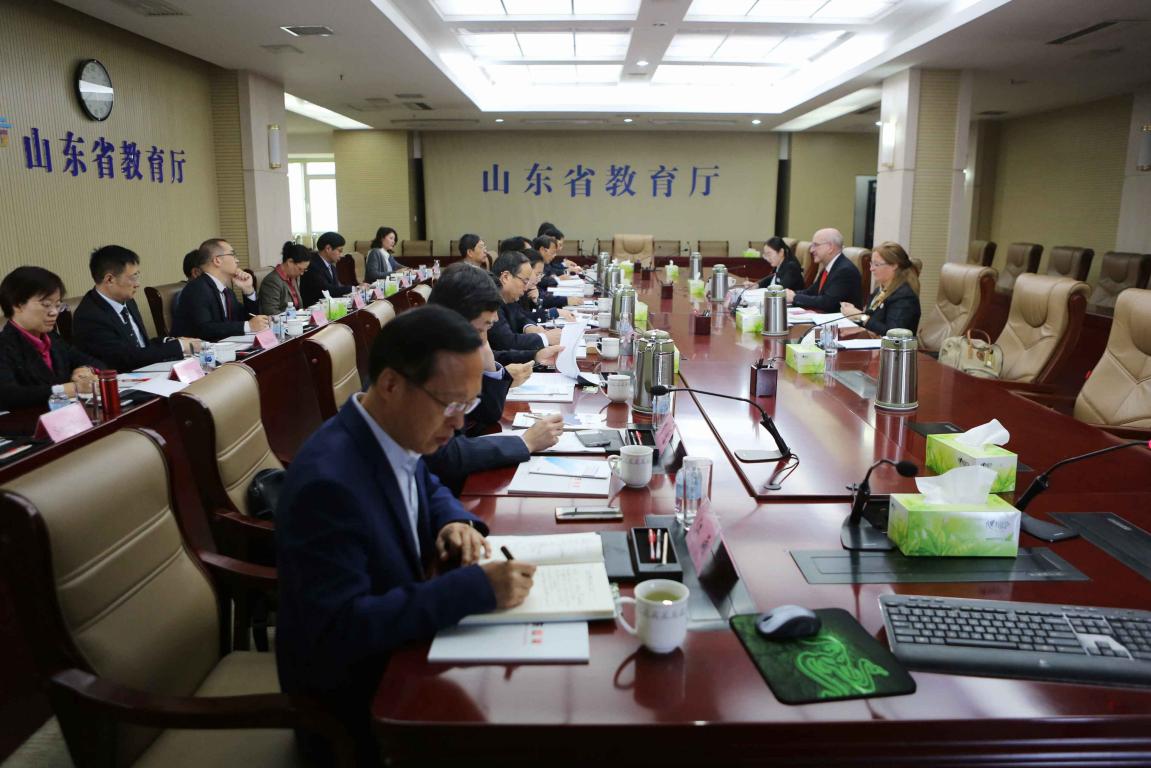 10月14日上午,党委书记车先礼一行赴山东省教育厅与英国赫尔大学校长团进行工作会谈。省教育厅厅长邓云峰主持会议。校党委书记车先礼,中国海洋大学、山东财经大学、济南大学、齐鲁工业大学(山东省科学院)、山东科技大学等高校负责人,英国赫尔大学副校长菲利普·吉尔马丁,学术合作办公室主任卡罗琳•米歇尔参加会谈。