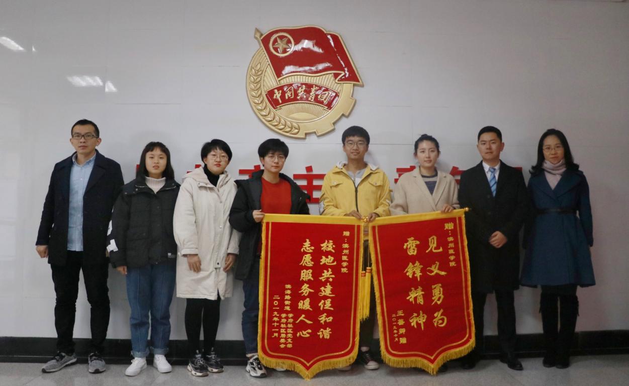 11月26日上午,滨海街道办事处工作人员王宏慧、杨清彦和学府小区居民任女士的家属,来到我校赠送“校地共建促和谐 志愿服务暖人心”、“见义勇为 雷锋精神”的锦旗,感谢我校学子救助落水居民、见义勇为的高尚之举和学校的仁爱育人培养,校团委负责同志和部分施救同学接受锦旗。