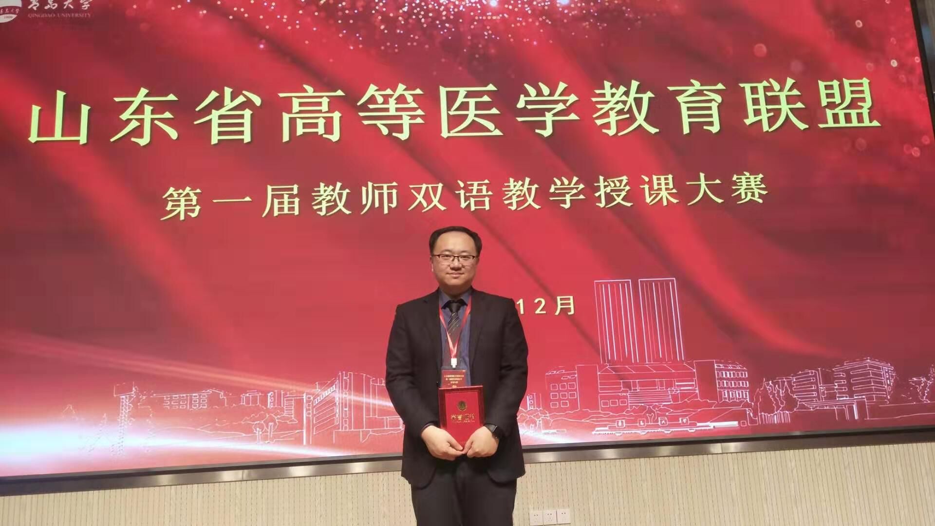 12月13日,由山东省高等医学教育联盟举办,青岛大学医学部承办的山东省高等医学教育联盟第一届教师双语教学授课大赛决赛在青岛举行,经过一天的激烈角逐,我校教师杨坚最终以97.53的最高分荣获一等奖第一名,充分展现了我校青年教师的教书育人风采和高超的双语授课技艺,得到评委高度赞誉。这是今年以来我校继青年教师范文翼、刘谕静双双荣获山东省第七届青年教师教学比赛一等奖后的再次突破。