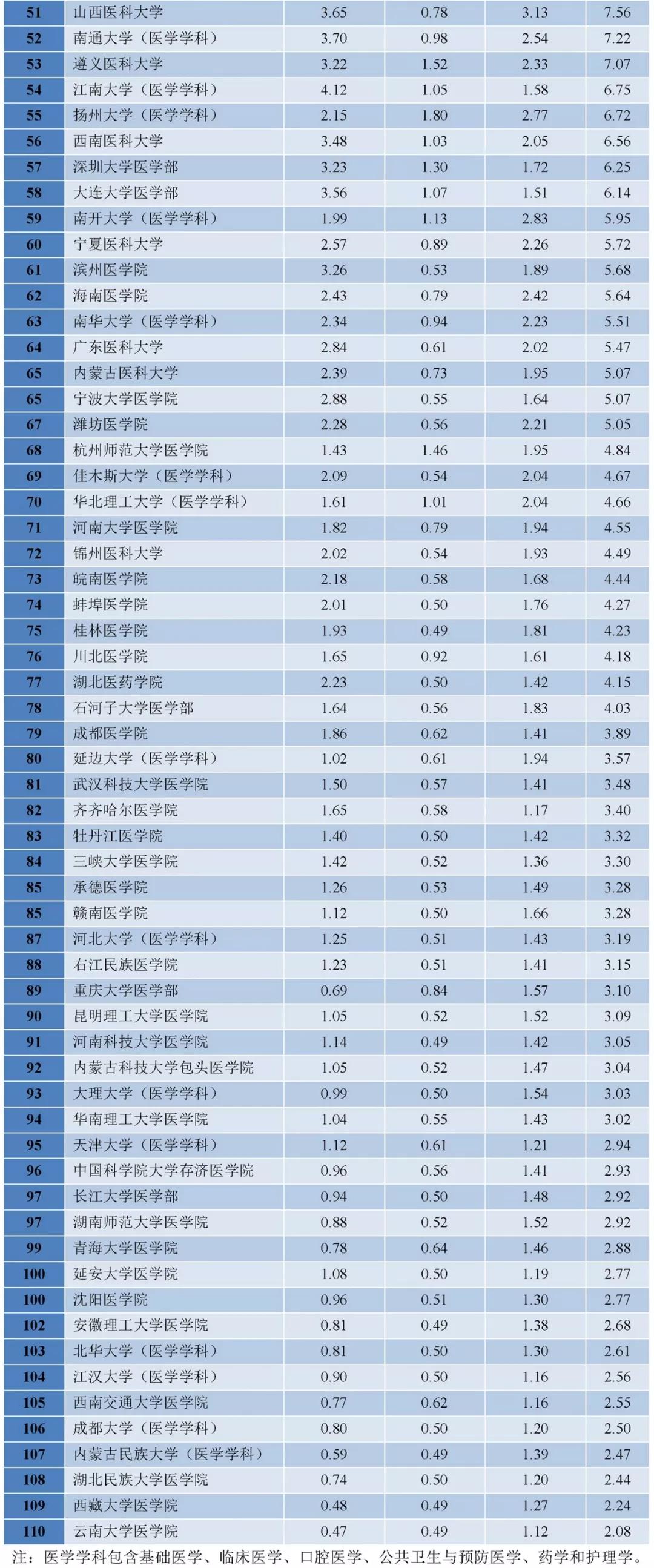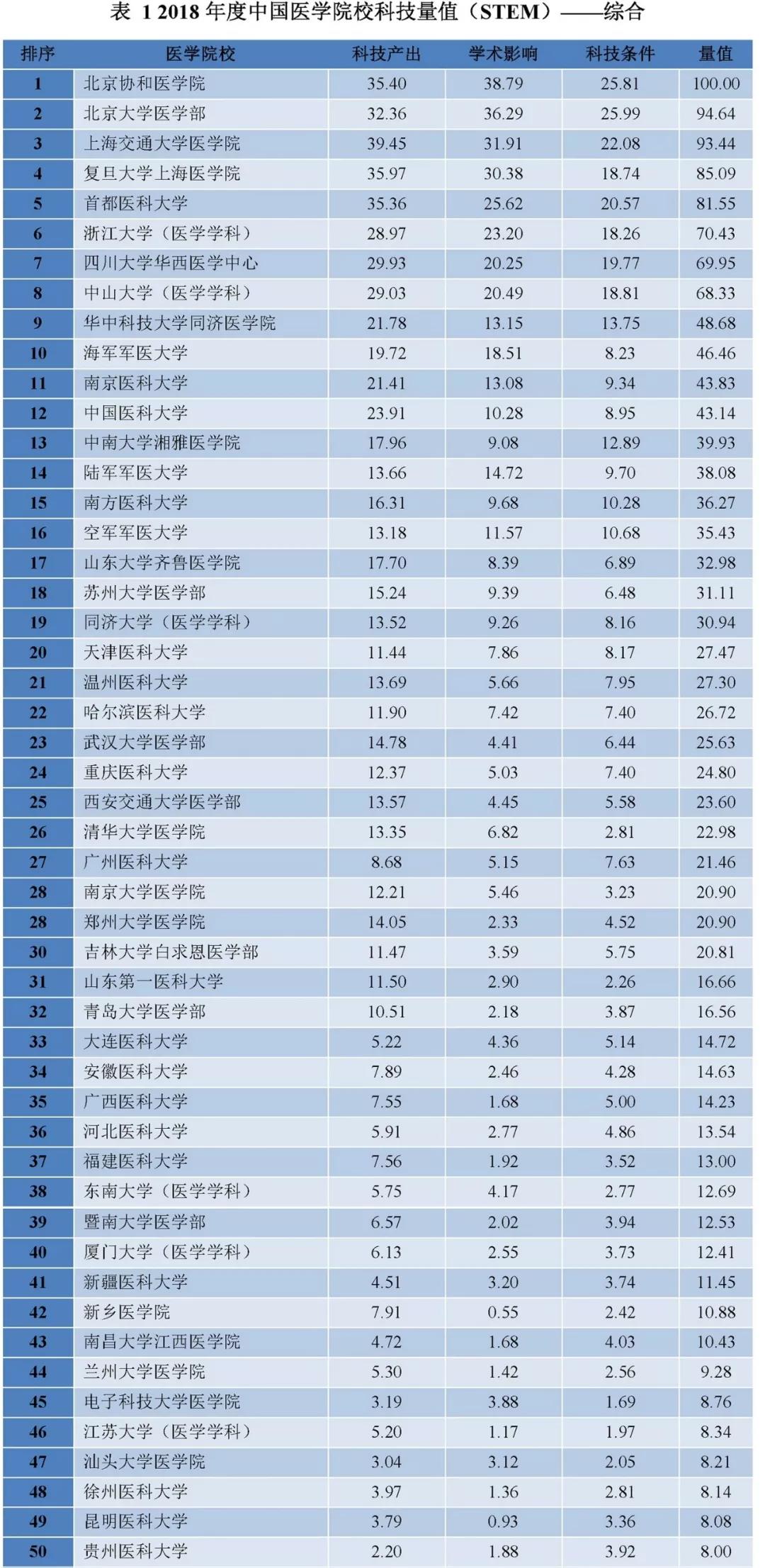 据了解,在科学知识创新和发展驱动下,世界一流水平大学建设已成为世界各国及其高等教育体系的工作重点。医学是我国学科体系的重要组成部分,医学科技评价是推动医学创新驱动发展的一项基础性工作,应根据高校发展特点,建立中国特色的评价体系。2019年,中国医学院校STEM项目组首次探索医学院校STEM研究,以期基于评价活动引领医学院校学科发展,助力医学科技创新。2018年度中国医学院校STEM参照医院STEM多维评价体系构建,同时结合医学院校学科建设与研究实际,纳入教育部工程研究中心、教育部国际合作联合实验室、高等学校科学研究优秀成果奖等可反映医学院校科技活动特点的指标,共对我国110所具有医学类相关专业研究生招生资格的独立医学院校以及设置医学相关学科的综合性大学开展研究。今年是首次发布中国医学院校科技量值(STEM)。