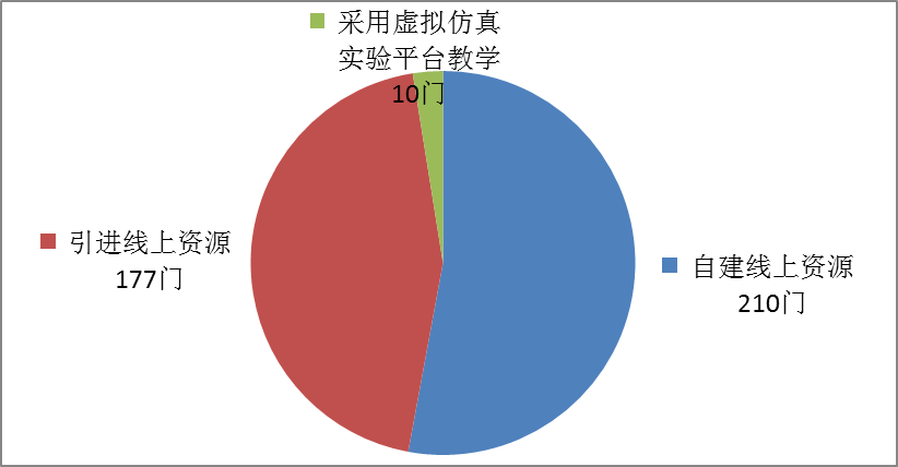 3.各类课程线上资源的选择以自建为主(210门,占比50.1%),引进线上资源177门,采用虚拟仿真实验教学平台10门。