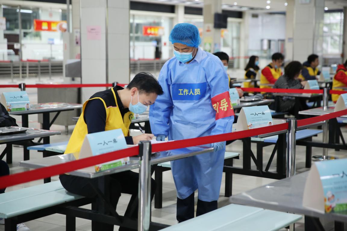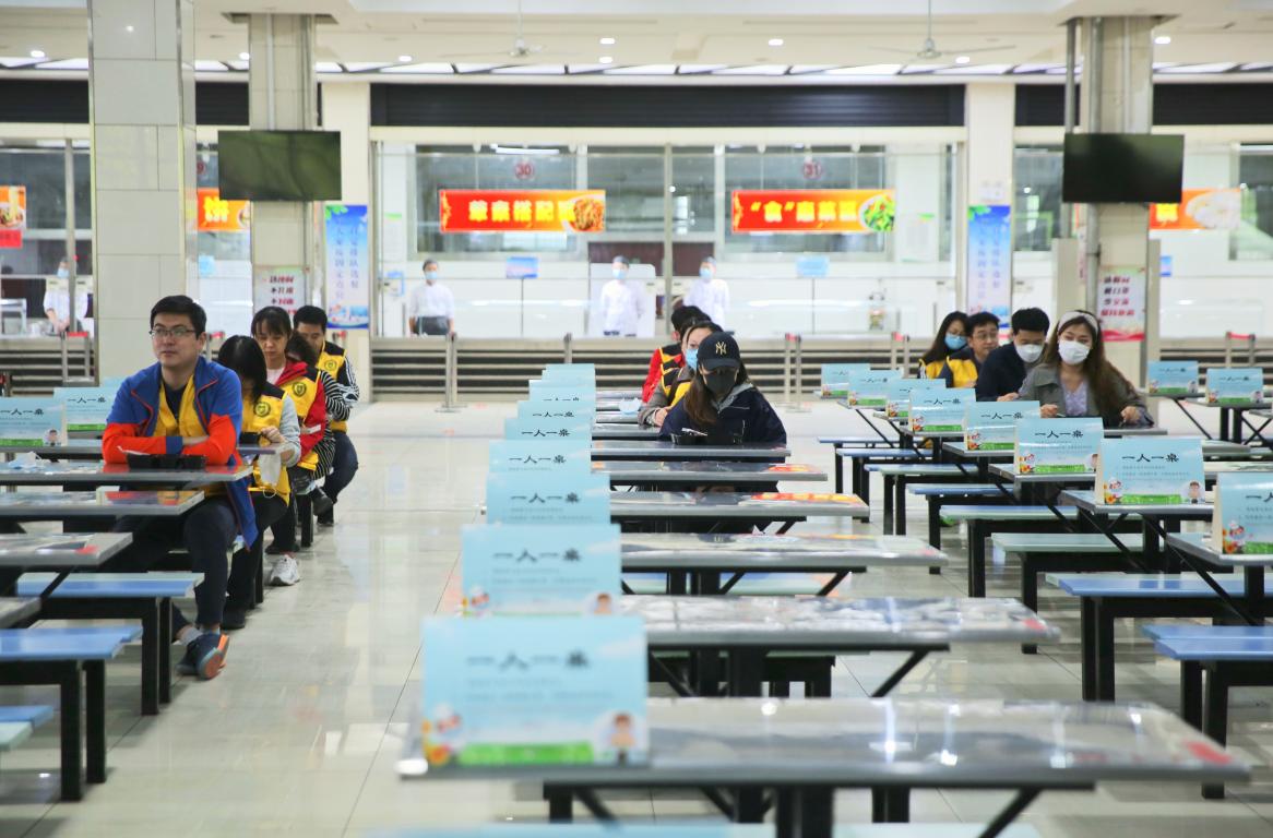 在餐厅就餐环节,学生间隔2米排队依次进入餐厅,测量体温、洗手消毒后买饭就餐。取餐后单人单桌单向用餐,尽量避免用餐时相互交谈,用餐后有序离开。学生若在餐厅自感不适,辅导员引导学生至临时观察点,对自感异常人员检测体温,确认体温异常,启动应急处置,并送定点医院发热门诊排查。与此同时工作人员对该区域就餐人员和各窗口工作人员进行登记、疏散学生,并对就餐环境进行消毒。