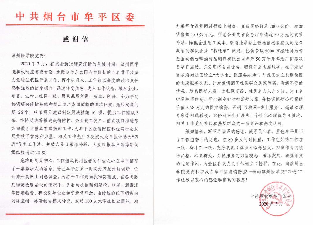 马东太在讲话中对工作组的工作进行了介绍。他指出,工作组4名成员觉悟高、素质好、能力强,两个多月来,工作组以高度的政治责任感和强烈的使命担当,迅速转变角色、进入工作状态,深入企业、项目、农村、社区一线,聚焦基层所需、所急、所盼,全力帮助协调解决疫情防控和复工复产方面面临的困难问题,先后发现问题26个,收集意见建议制定解决措施16项,提出工作建议3条,在协助统筹推进疫情防控、企业复工复产、重点项目推进等方面做了大量卓有成效的工作,相关工作先后2次被大众日报评选为“四进”优秀工作法,并被人民日报海外版、大众日报客户端等新闻媒体报道近20次,为牟平区疫情防控和经济社会发展贡献了智慧和力量。