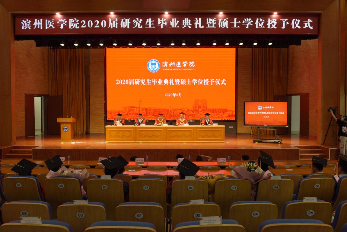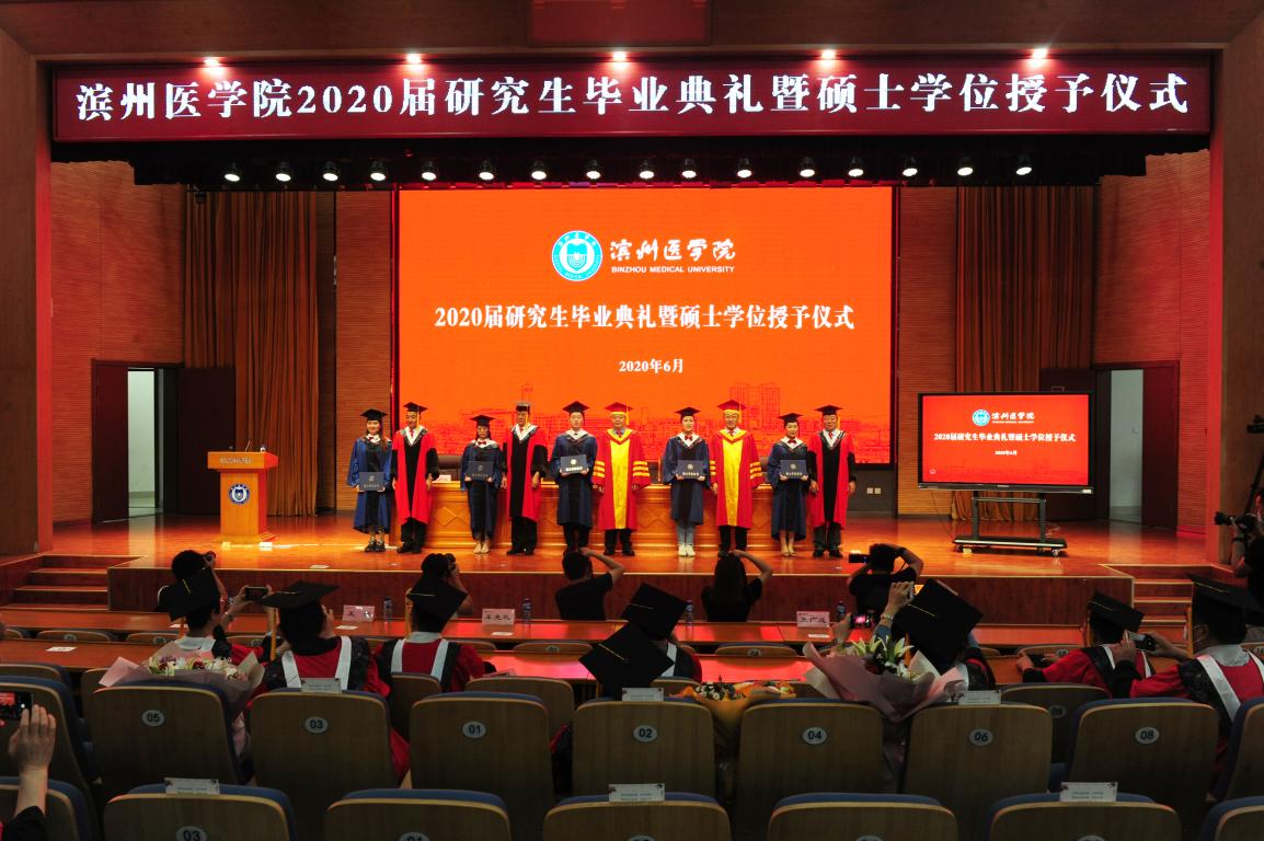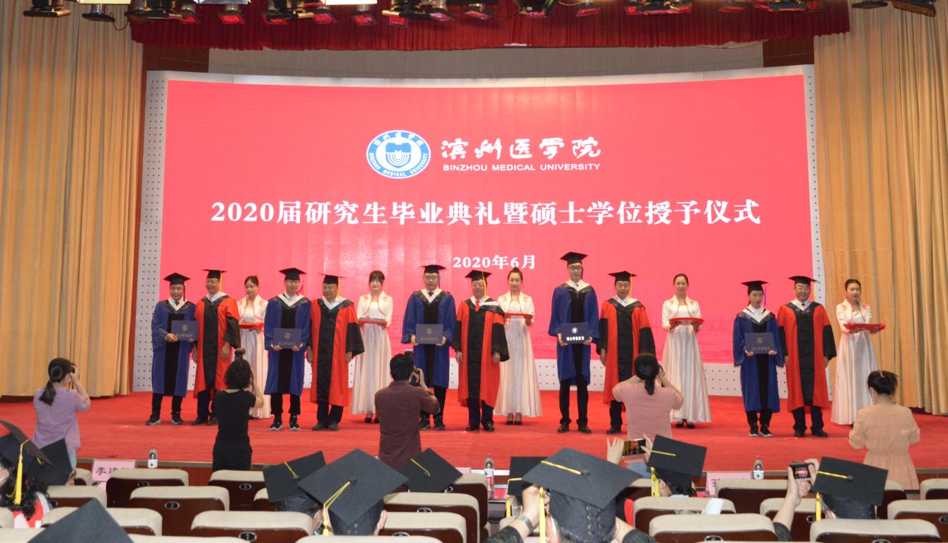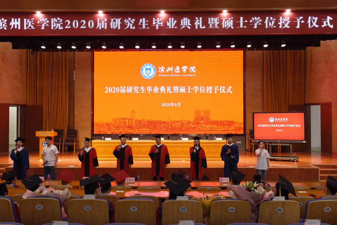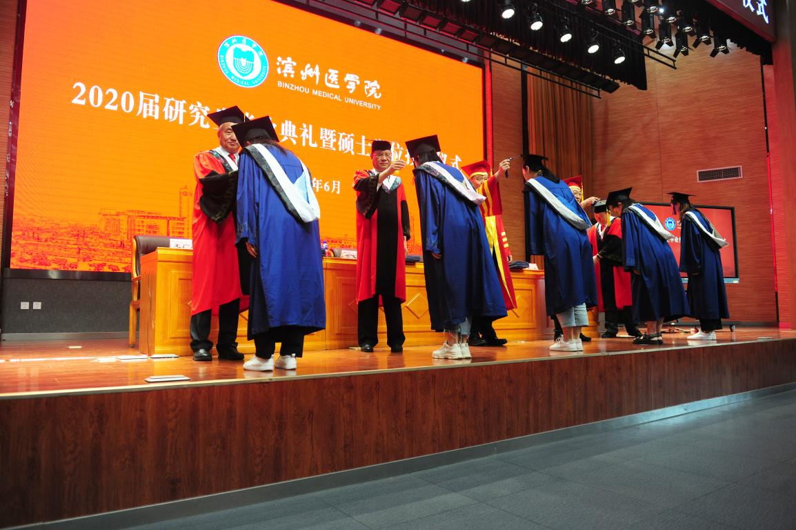 典礼上,白咸勇宣读了表彰2020届优秀毕业生的通报;王广成宣读了授予硕士学位的通知;参加典礼校领导和部分学位委员会成员为在现场的2020届硕士研究生授予学位并颁发学位证书;车先礼、王滨为未到达现场的毕业生代表进行“云端”拨穗。毕业生代表张超、研究生导师代表李洪波、毕业生家长代表曹风海分别作了发言,表达了对母校的感恩和留恋,对学子的祝福和希望,对滨医的感谢和祝愿。