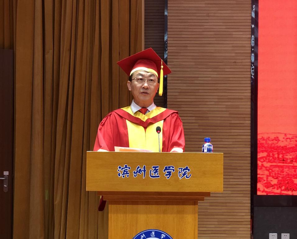 王滨在讲话中代表学校向圆满完成学业的全体硕士研究生表示热烈的祝贺,向悉心指导同学们的导师及为同学们的成长付出辛勤劳动的广大教职员工表示最衷心的感谢,向关注滨医发展、支持各位同学完成学业的家长及亲友们表示最诚挚的敬意,对即将毕业的研究生同学们提出希望和要求。他希望同学们,一要胸怀宽广,心系天下,要怀揣为天地立心、为民生立命、为事业献身的理想,把自己的成长成才立足于岗位之中,融入到国家的进步和民族的振兴之中;二要勇挑重担,挑战极限,要勇于尝试,勇于开拓,把吃亏当作锻炼,把困难当作考验,在负重中、在担当中撑起一片天空,成就一番事业;三要勇于钻研,勇于创新,要用创新去发现新世界,用勇气去开启新世界,用坚持去拥抱新世界,致力于重大原始创新,努力攀上科技高峰。