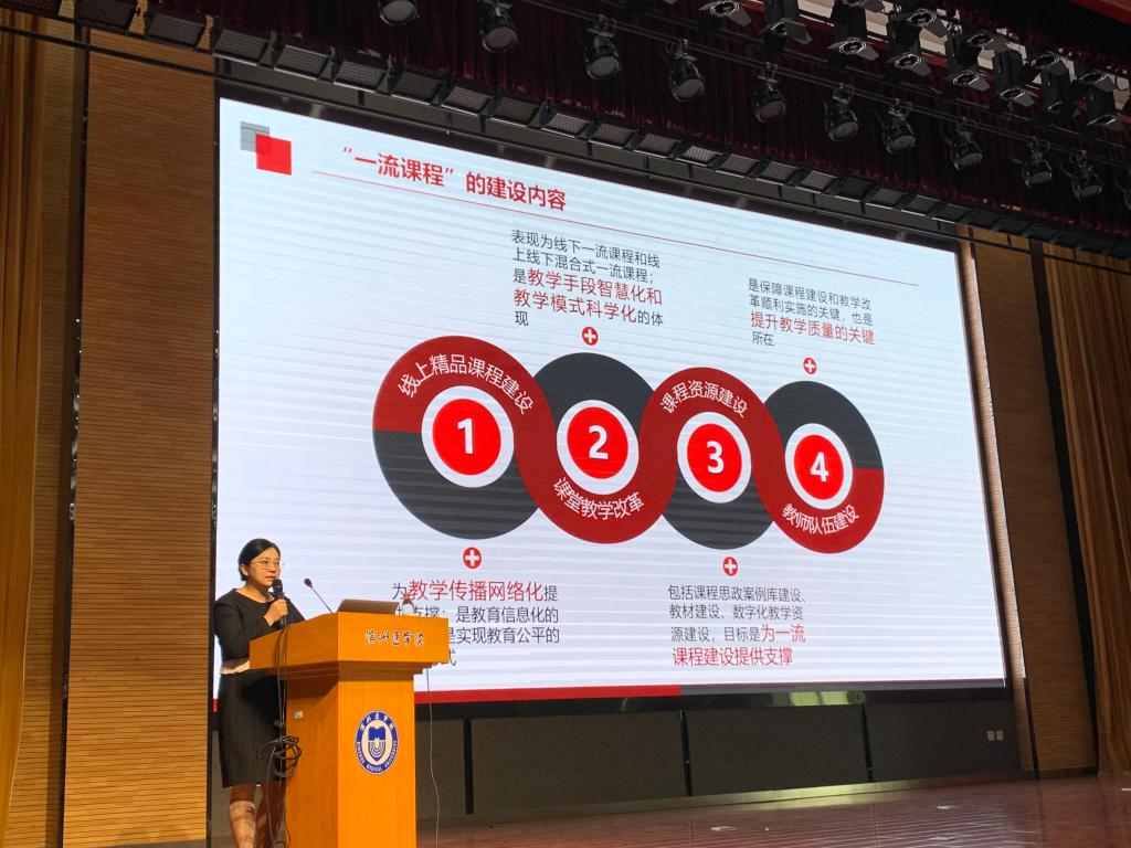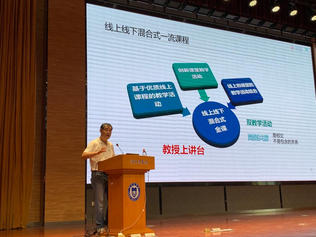 王震亚教授以《从慕课到金课:一流课程建设与申报》为题,围绕国家一流课程建设与申报,介绍了一流本科课程“双万计划”的认定情况,分享了线上线下混合式一流课程申报的经验,他强调一流本科课程要有自己的特色,要在教学和课程建设过程中展示独特的教学理念,并将优质课程资源用于教学、用于课堂。
